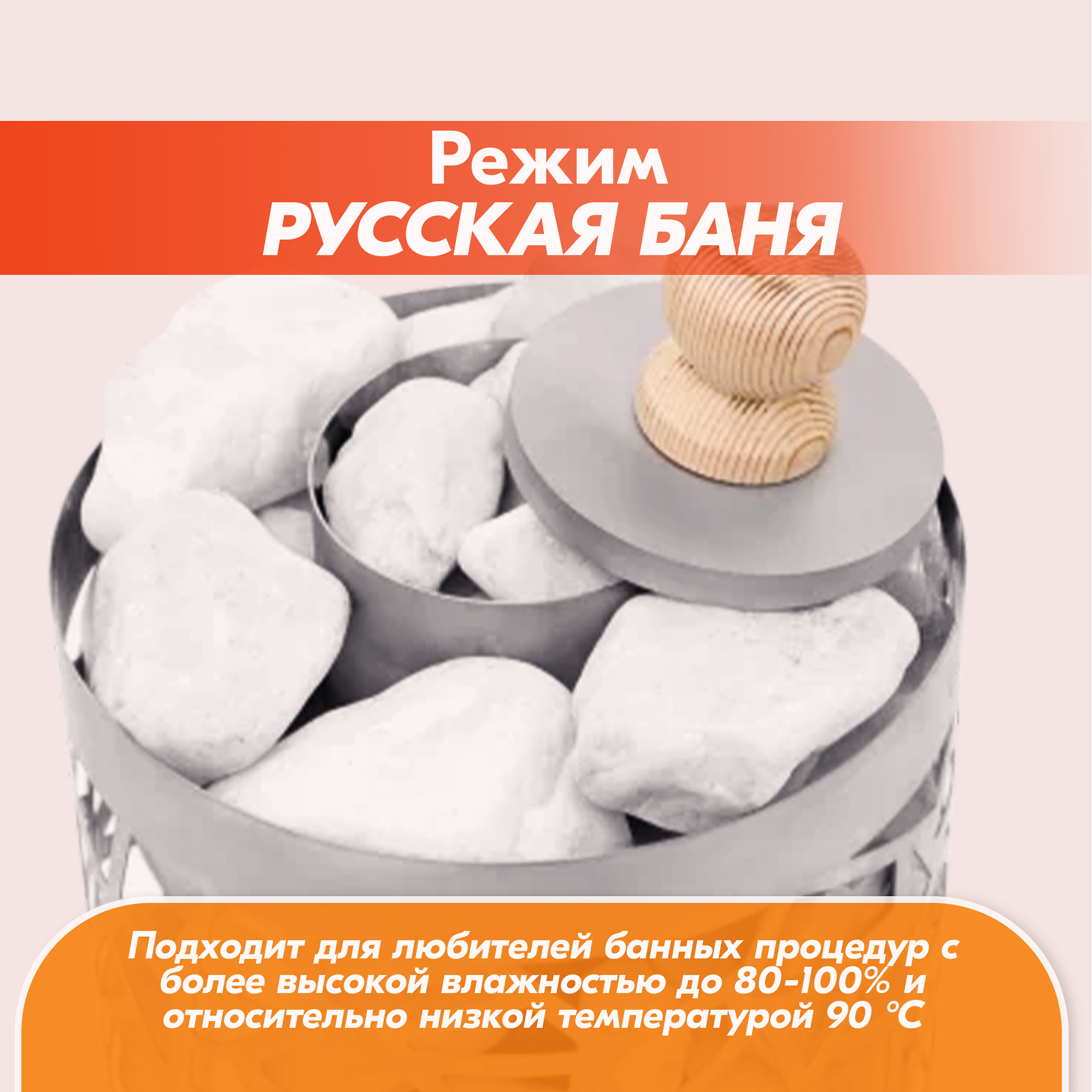 Режим «Русская баня» подходит для любителей банных процедур с более высокой влажностью до 80-100% и относительно низкой температурой 90 °С.