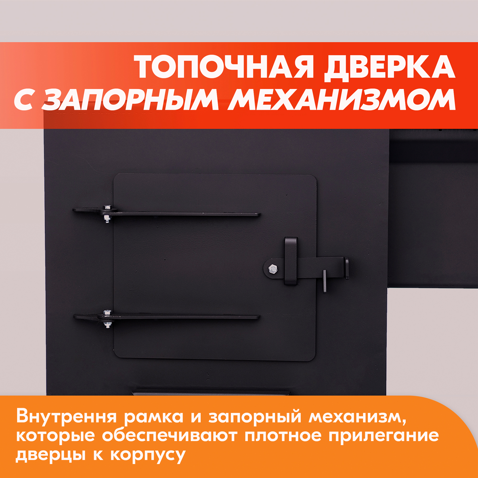 Топочная дверца очага для казана оснащена внутренней рамкой и запорным механизмом, которые обеспечивают плотное прилегание дверцы к корпусу казан-мангала и способствуют защите ее от деформации в процессе эксплуатации.