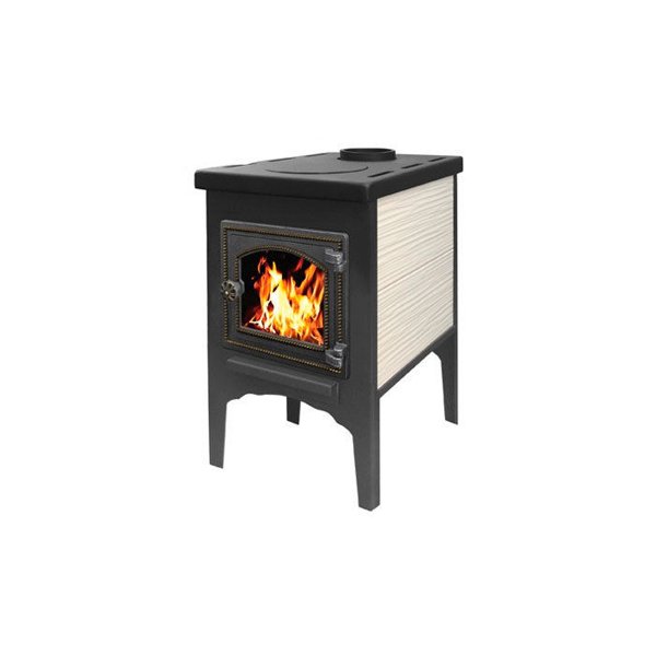 Верхнюю горизонтальную поверхность можно использовать для приготовления пищи. Печь укомплектована чугунным колосником и чугунной негерметичной дверцей Везувий ДТ-4. Печь облицована керамической плиткой для лучшего распределения тепла.